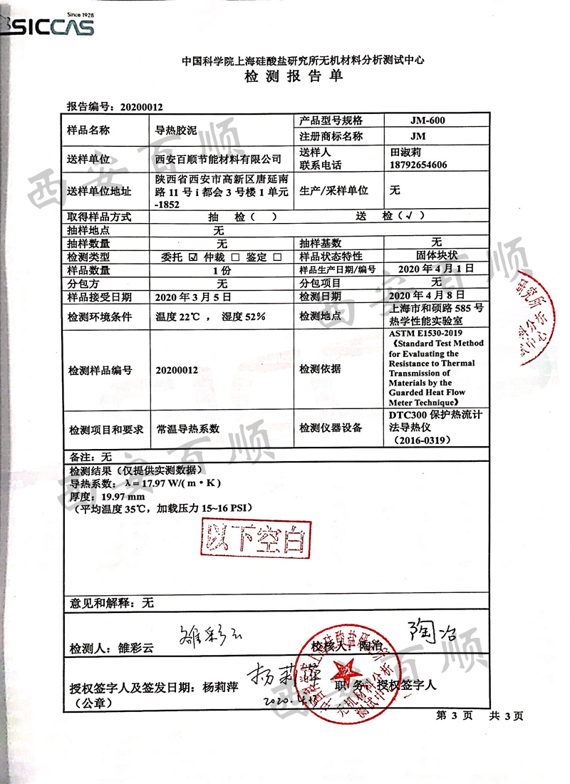 •        西安百順節(jié)能材料有限公司成立于1998年,二十五年來,我們專心、專注于導(dǎo)熱膠泥產(chǎn)品的研發(fā)、生產(chǎn);企業(yè)通過ISO9001:2015質(zhì)量管理體系認(rèn)證,制定了Q/BS 001-2020《無機(jī)型導(dǎo)熱膠泥》企業(yè)標(biāo)準(zhǔn),經(jīng)過不斷的研發(fā)、優(yōu)化,成功開發(fā)、生產(chǎn)、銷售了針對不同工藝、不同材質(zhì)、方便施工的JM-250、JM-600、JM-800、JM-1000系列導(dǎo)熱膠泥,年生產(chǎn)能力2000噸;